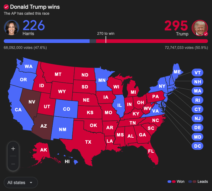 Was it the Israeli war in Gaza/Palestine? Was it just blatant and aggressive misogyny? Was it the xenophobia and racism endemic in the US? Was it trans rights? Was it… was it literature? Or us gays? Was it merely the pervasive, caustic shortsightedness of the electorate? Was it immigration? Was it economic factors like inflation, housing, and/or interest rates? Because, I mean, individually none of these are good excuses to vote for a convicted felon and rapist who idolises Adolf Hitler, denigrates people of colour, and vociferously disparages the men and women who’ve volunteered to serve in our military. Even together, these issues do not—no matter how you feel about them—form a rational reason to vote for the Trump/Vance ticket and I just do not understand how anyone could look at the facts, the issues, and the candidates, taking into account past performance, and come to the conclusion that Trump is the better of the two choices we had for the presidency in 2024.